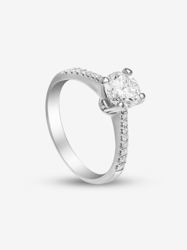 A showstopping 0.91 carat diamond sits at the heart of this ring, catches light from every angle. Set in 18K white gold band, it’s the perfect piece to wear alone or stack with other favourites.